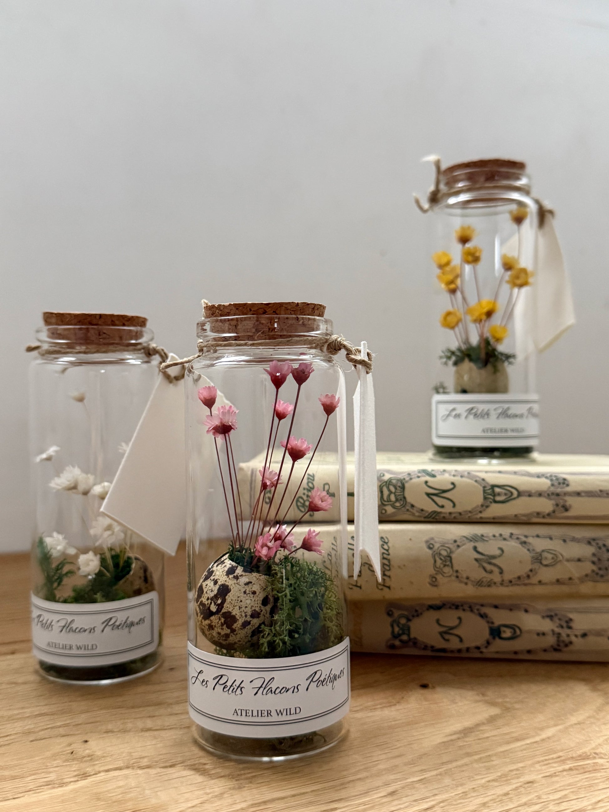 Dans chaque flacon, une coquille d’œuf posée sur un lit de lichen végétal accueille de fines fleurs séchées. Comme un minuscule jardin sous verre, chaque pièce capture un fragment de nature et le transforme en petite scène poétique à déposer chez soi.