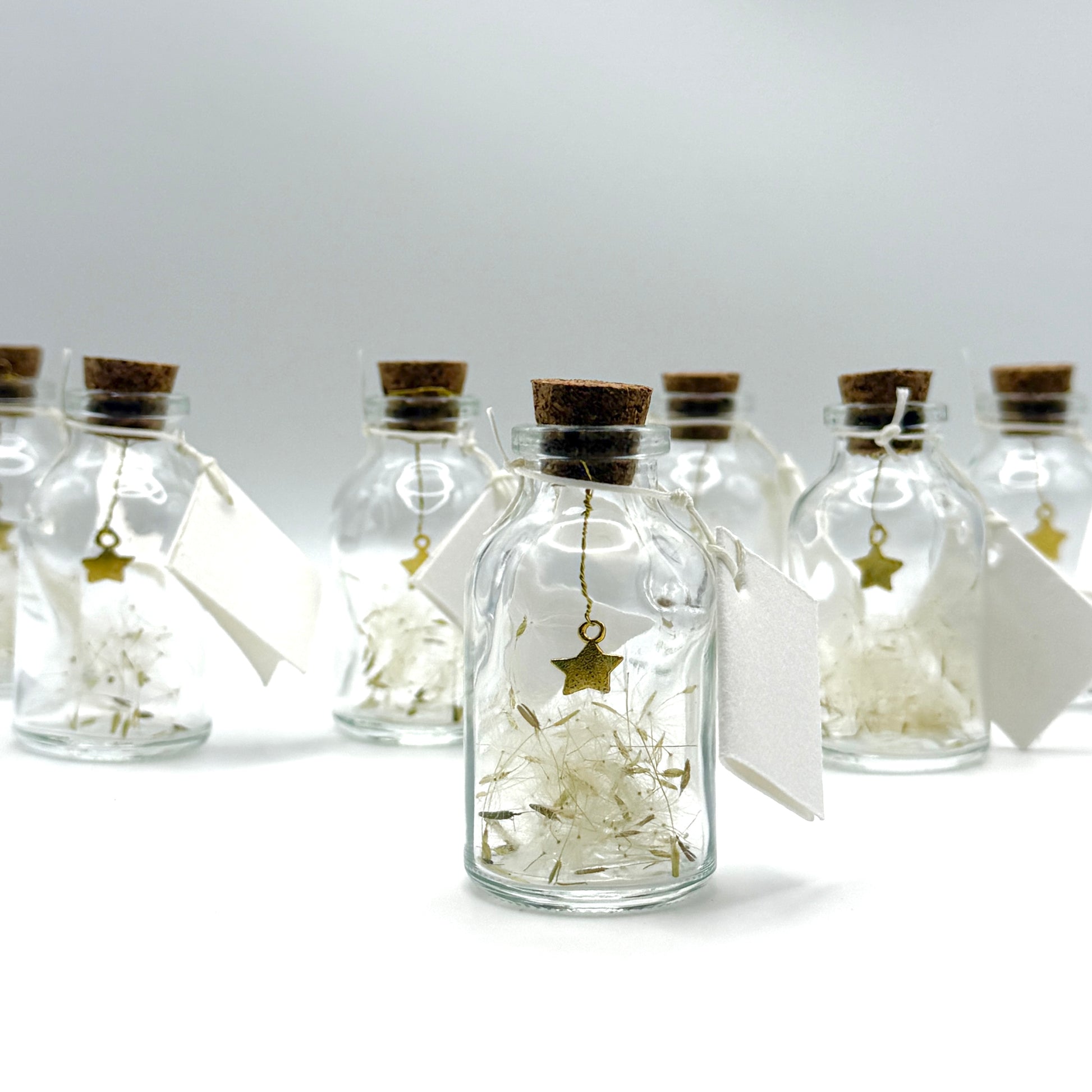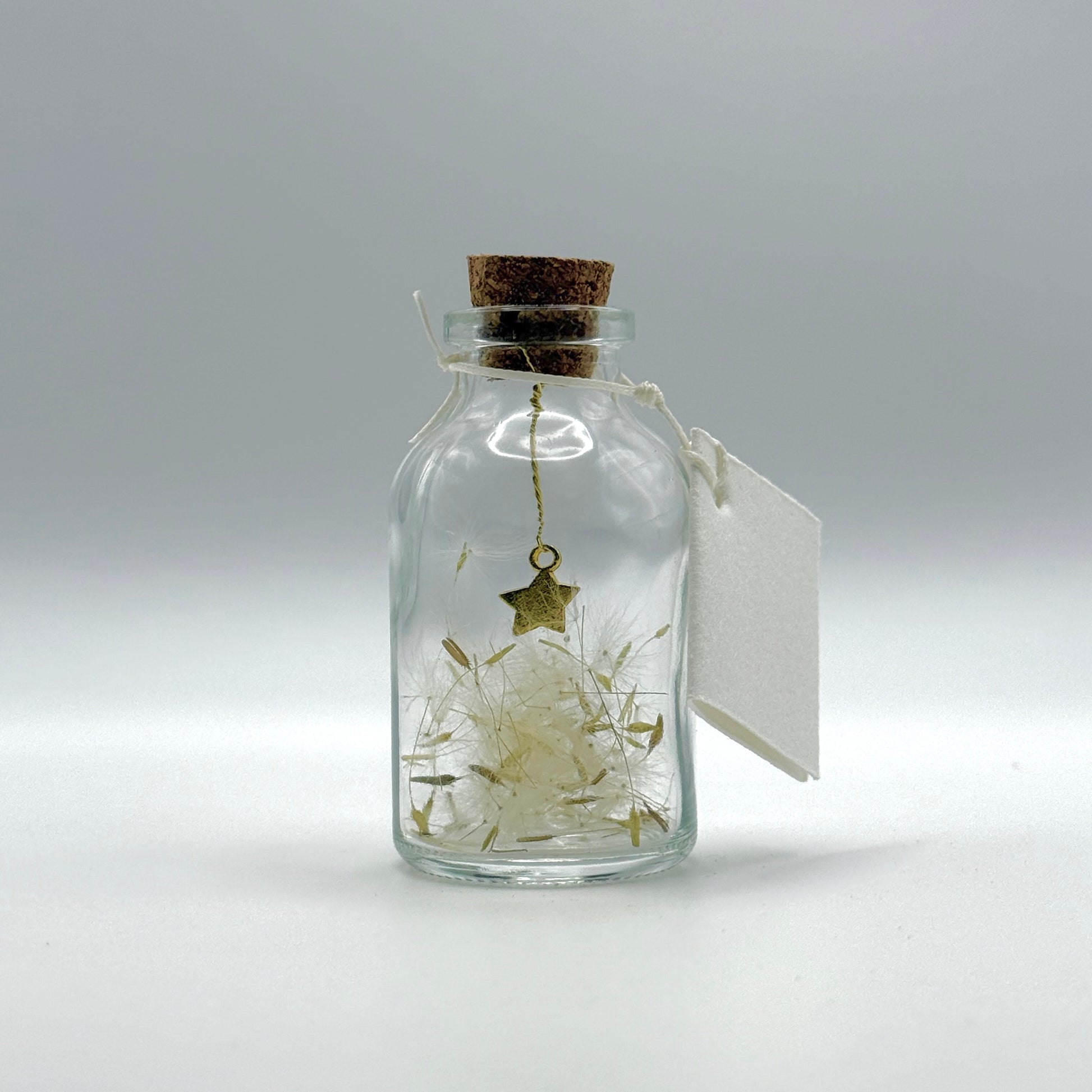 Dans une petite bouteille en verre transparent, une étoile dorée est suspendue au bouchon, juste au-dessus d’un lit d’aigrettes de pissenlit (akènes). La scène est poétique et aérienne. Au goulot, une seconde étoile accompagne une petite carte à personnaliser pour écrire un mot.
